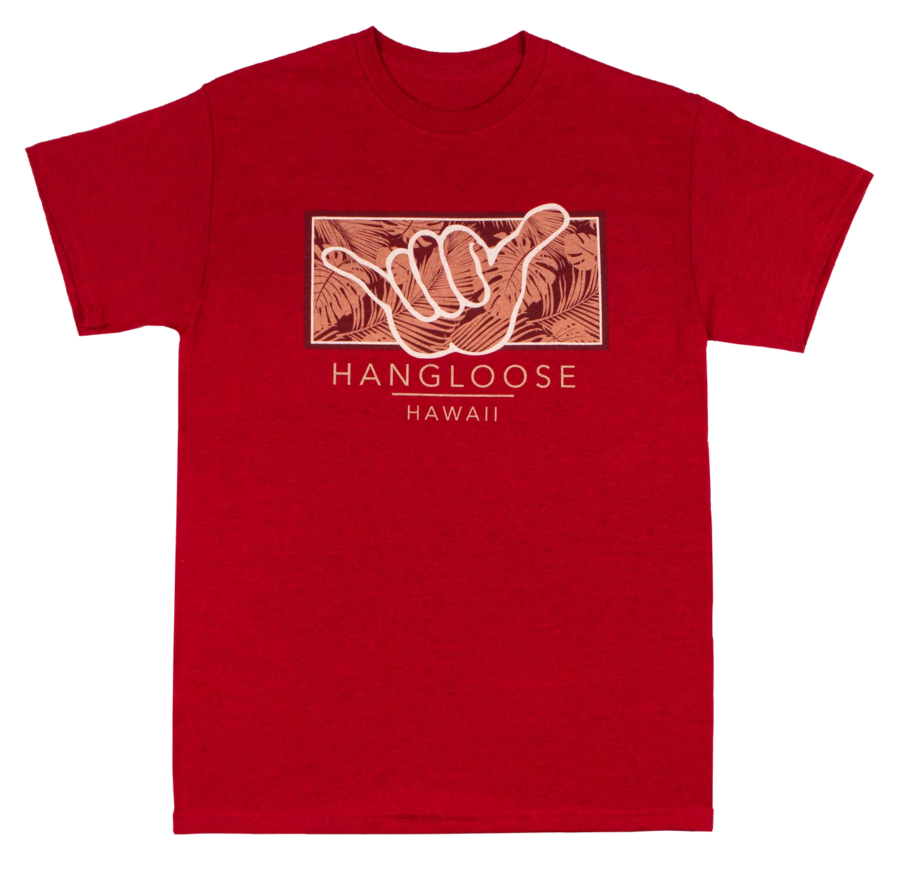 The iconic “Shaka,” known throughout the Hawaiian islands as a casual and friendly greeting, laid over a monstera and fern leaf background.