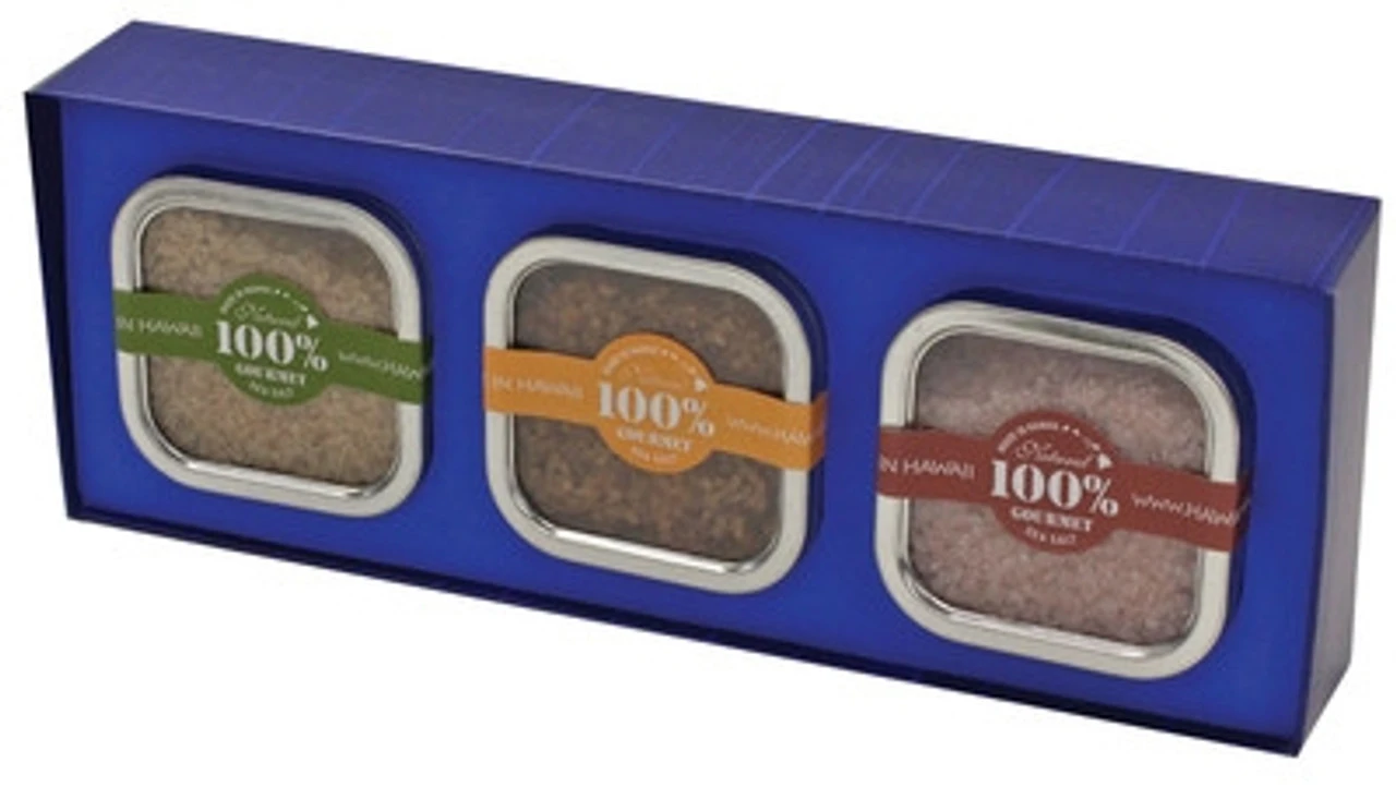 Our Hawaiian Salt Sampler is luxuioriously packaged in a silver foil, embossed gift set of three. Each salt