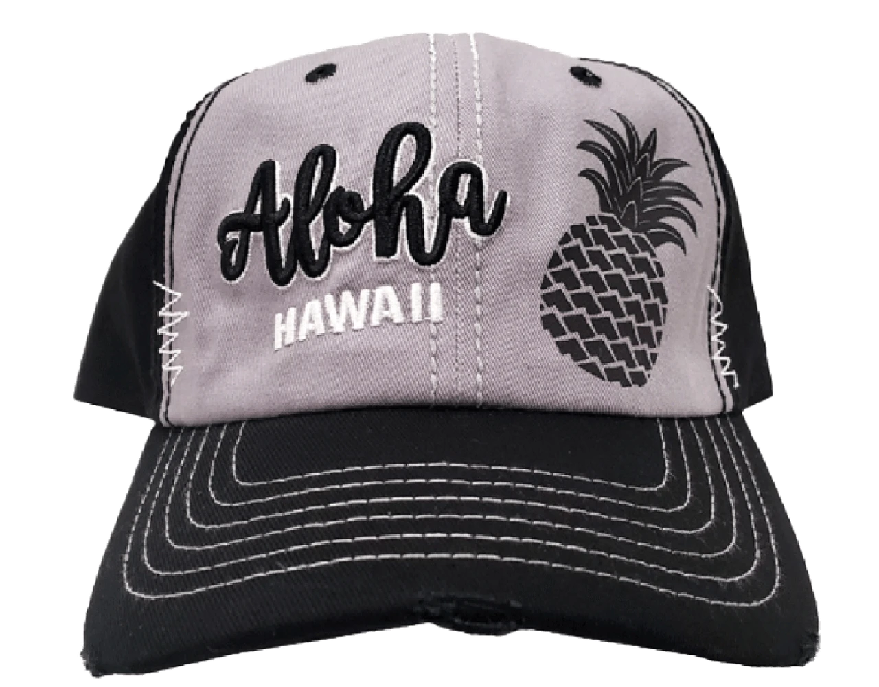 Vintage washed cotton twill frayed bill cap with embroidered Hawaiian design.