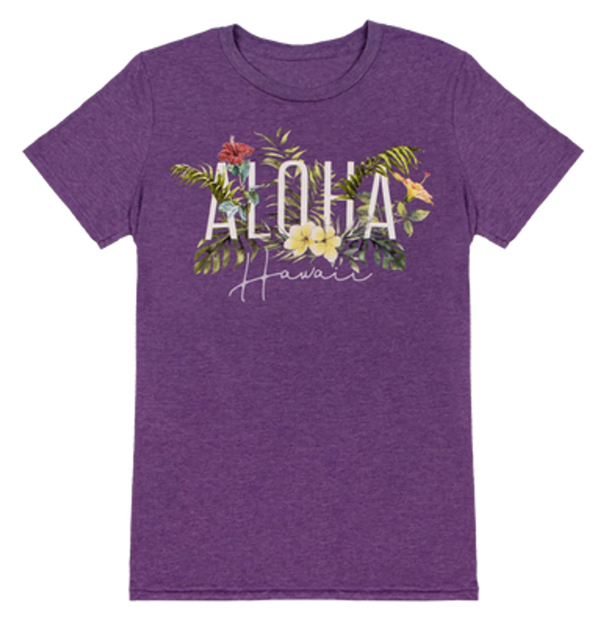 Garden Aloha Hawaii tee blooming with red and yellow hibiscus flowers and monstera fern leaves.