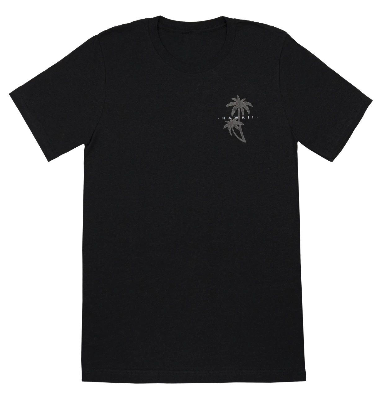 Stylized shorebreak background with idyllic palm tree silhouettes.